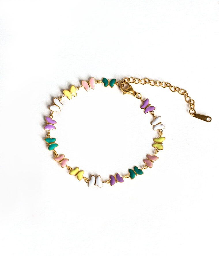 Bracelet ajustable en acier inoxydable composé de petits papillons aux couleurs douces et pastel.