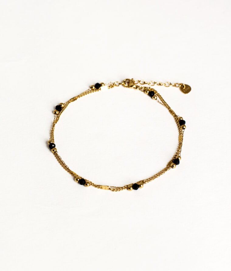 Deux chaînes de cheville en une pour un rendu encore plus précieux ! On mixe les chaînes, les mailles et on y ajoute de jolies perles en agate noire pour un pièce ultra douce.